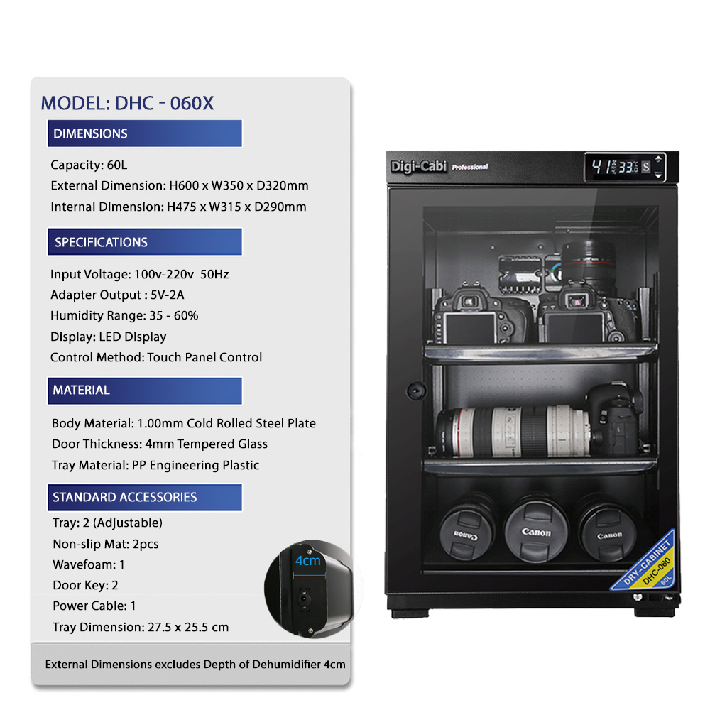 External Dimension: H591 x W351 x D319mm (excluding dehumidifier 40mm & Handle 35mm)