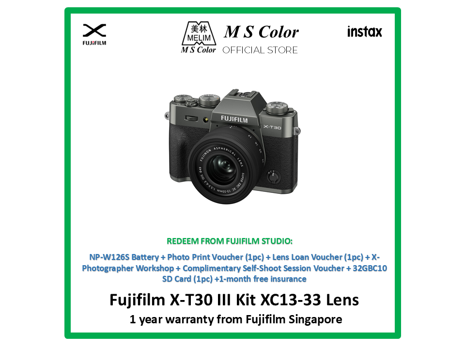 Redeem from Fujifilm X Space: Np W-126 battery x1, Photo Print Voucher X1, Lens loan voucher x1, X-photography workshop x1, Complimentary self shoot session voucher x1, 32GB SD Card, 1 month free insurance